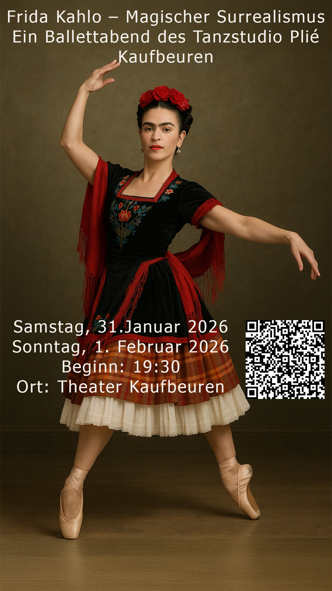 Ballettabend: „Frida Kahlo – Magischer Surrealismus“ Am Samstag 31. Januar und Sonntag 01. Februar 2026 jeweils um 19:30 Uhr im Stadttheater Kaufbeuren (Rosental 8) präsentieren wir einen außergewöhnlichen Ballettabend über das faszinierende Leben und die magische, surreale Bilderwelt von Frida Kahlo.Ein Abend voller Emotion, Farbe, Fantasie, Bewegung und Kunst!Für Zuschauer ab 8 Jahren geeignet.